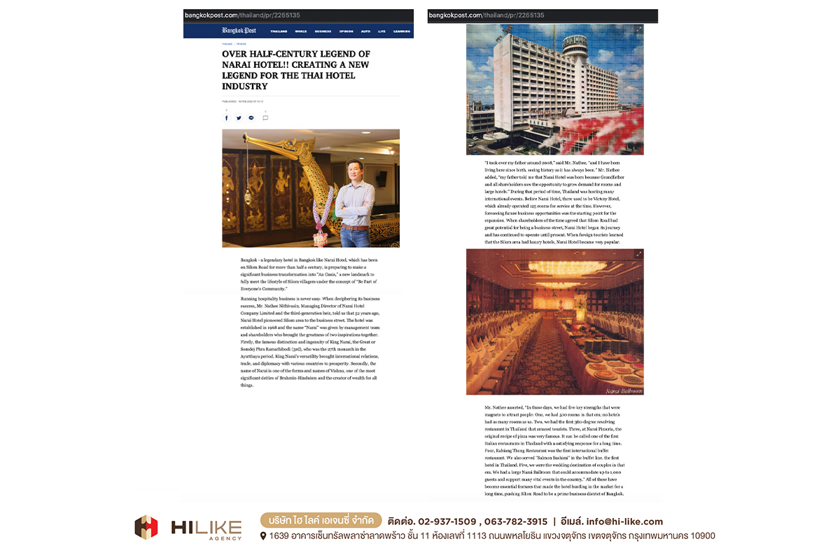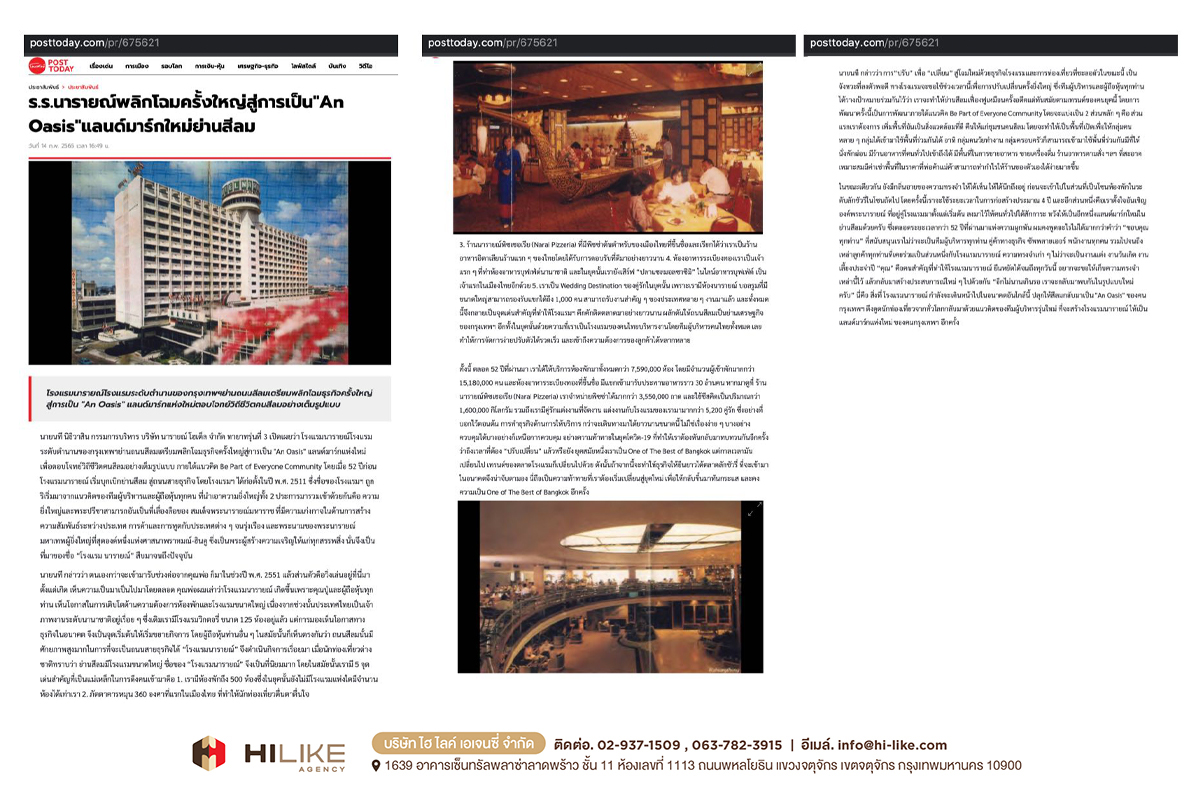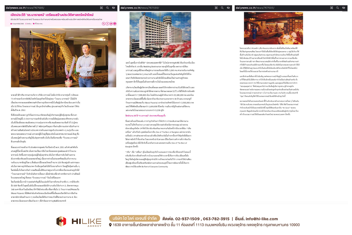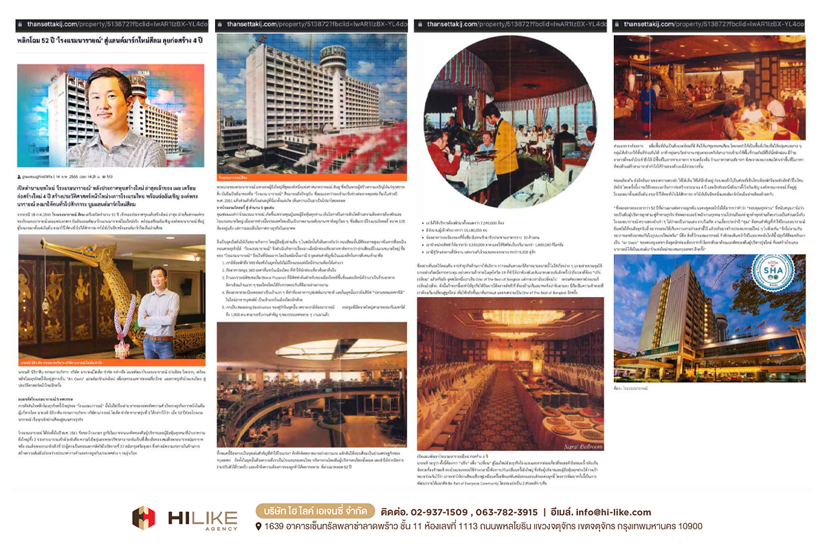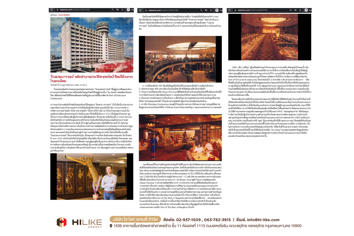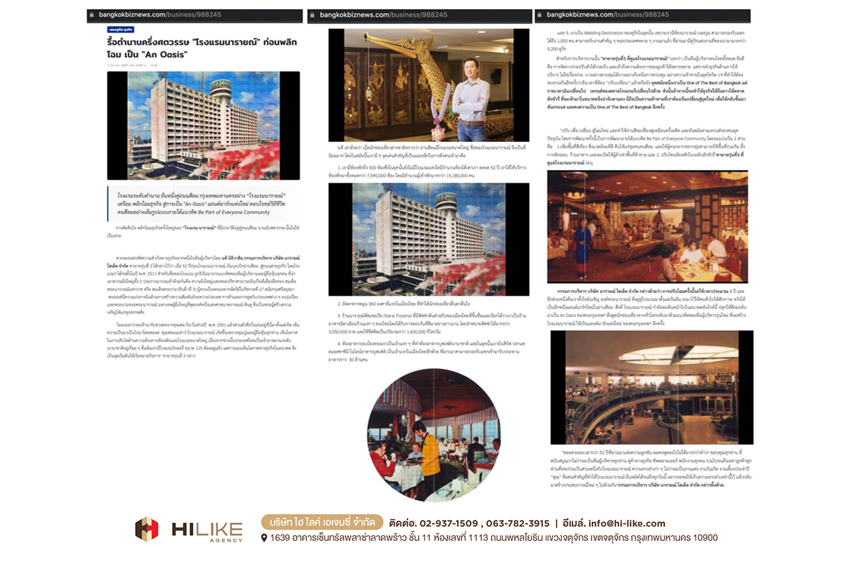 กรุงเทพฯ – ถนนย่านสีลม มีศักยภาพสูงมาก ในการผลักดันพื้นที่ ให้กลายเป็นถนนสายธุรกิจที่พลิกโฉมหน้ากรุงเทพฯ สู่การขับเคลื่อนเศรษฐกิจมหภาค “โรงแรมนารายณ์” ถือเป็นหนึ่งในพลังขับเคลื่อนนั้นด้วย ตั้งแต่อดีตจนถึงปัจจุบัน ด้วยสถานการณ์ บริบททางสังคม และปัจจัยด้านความต้องการของผู้บริโภคที่เปลี่ยนไป